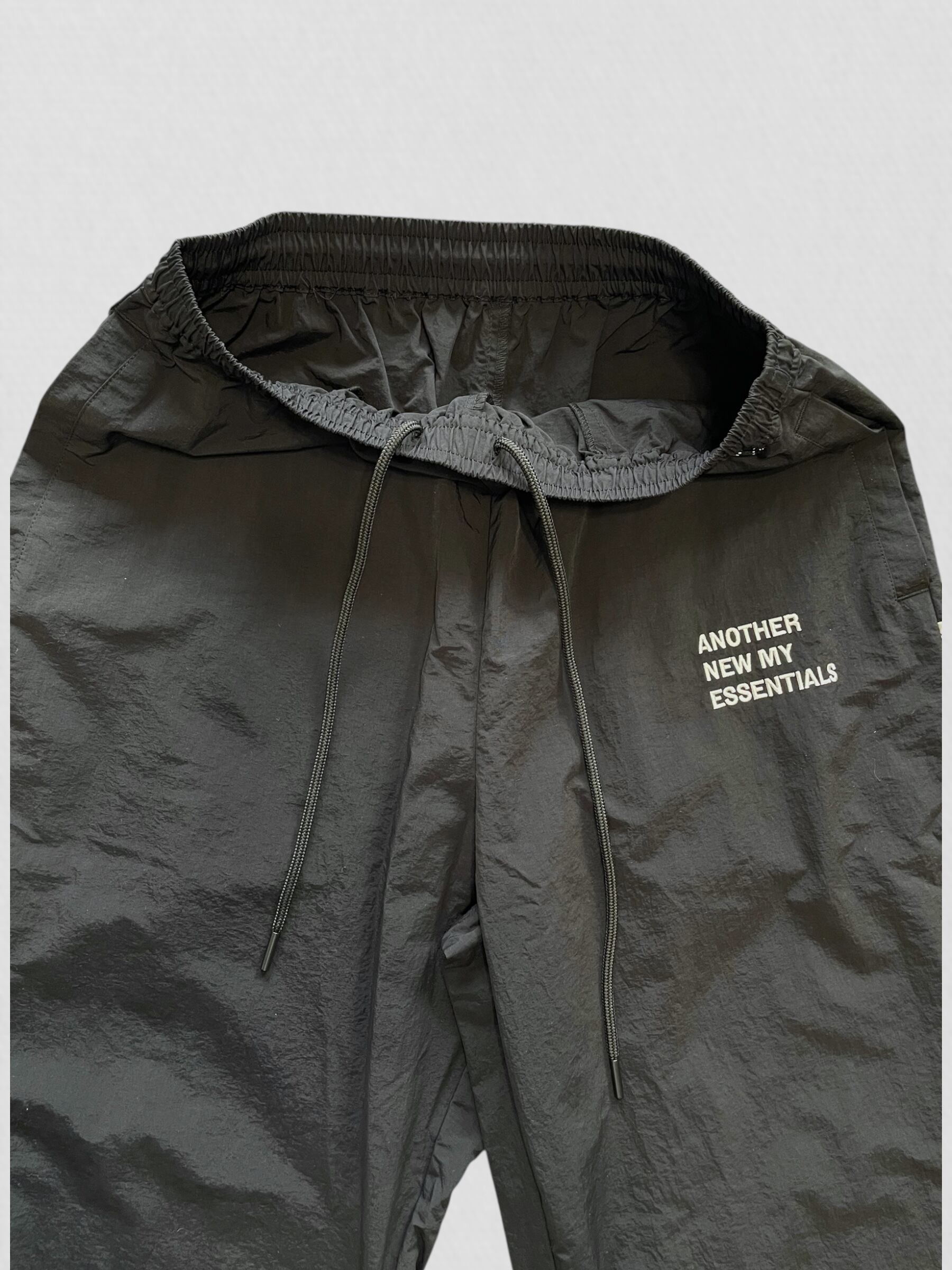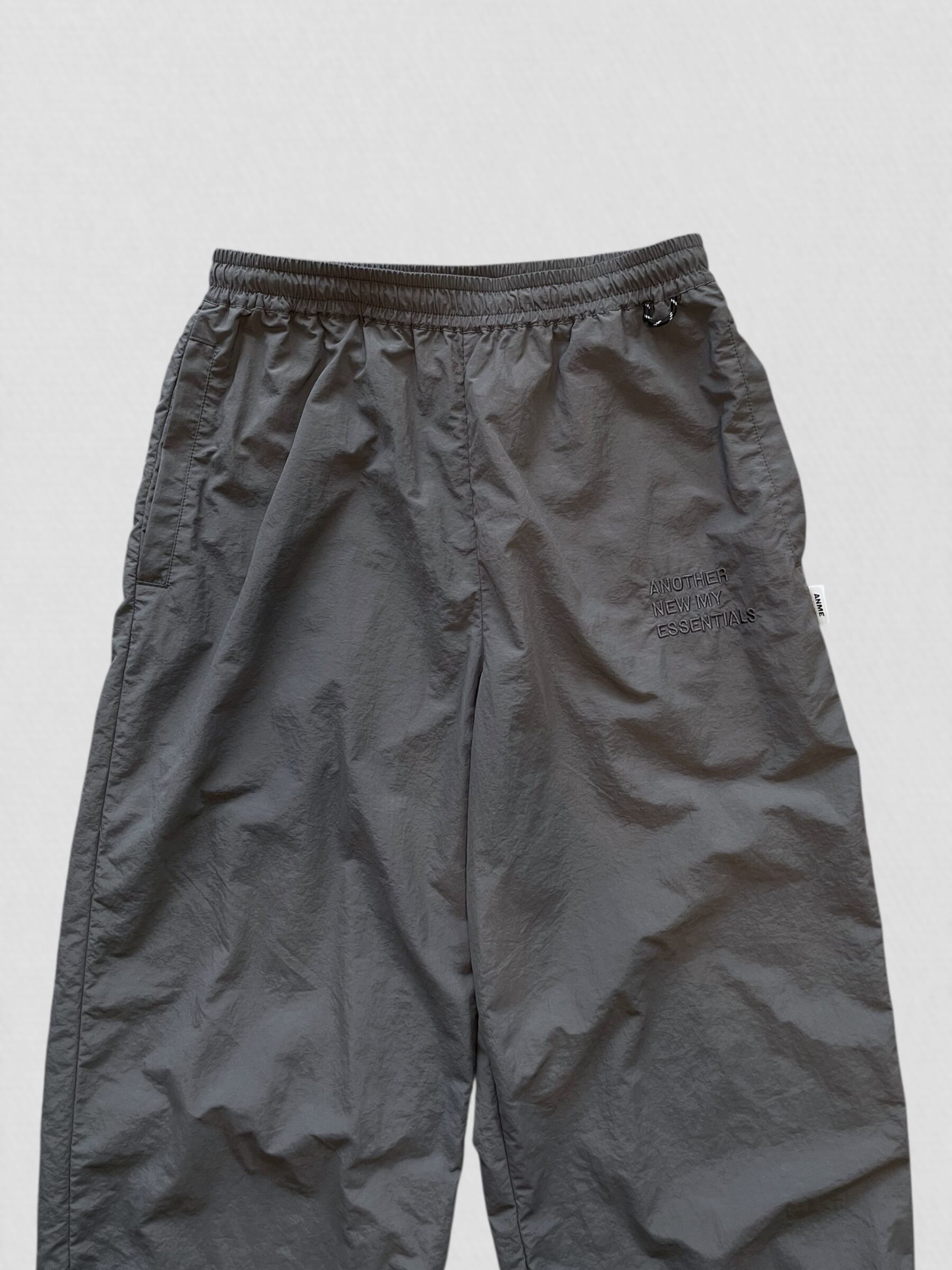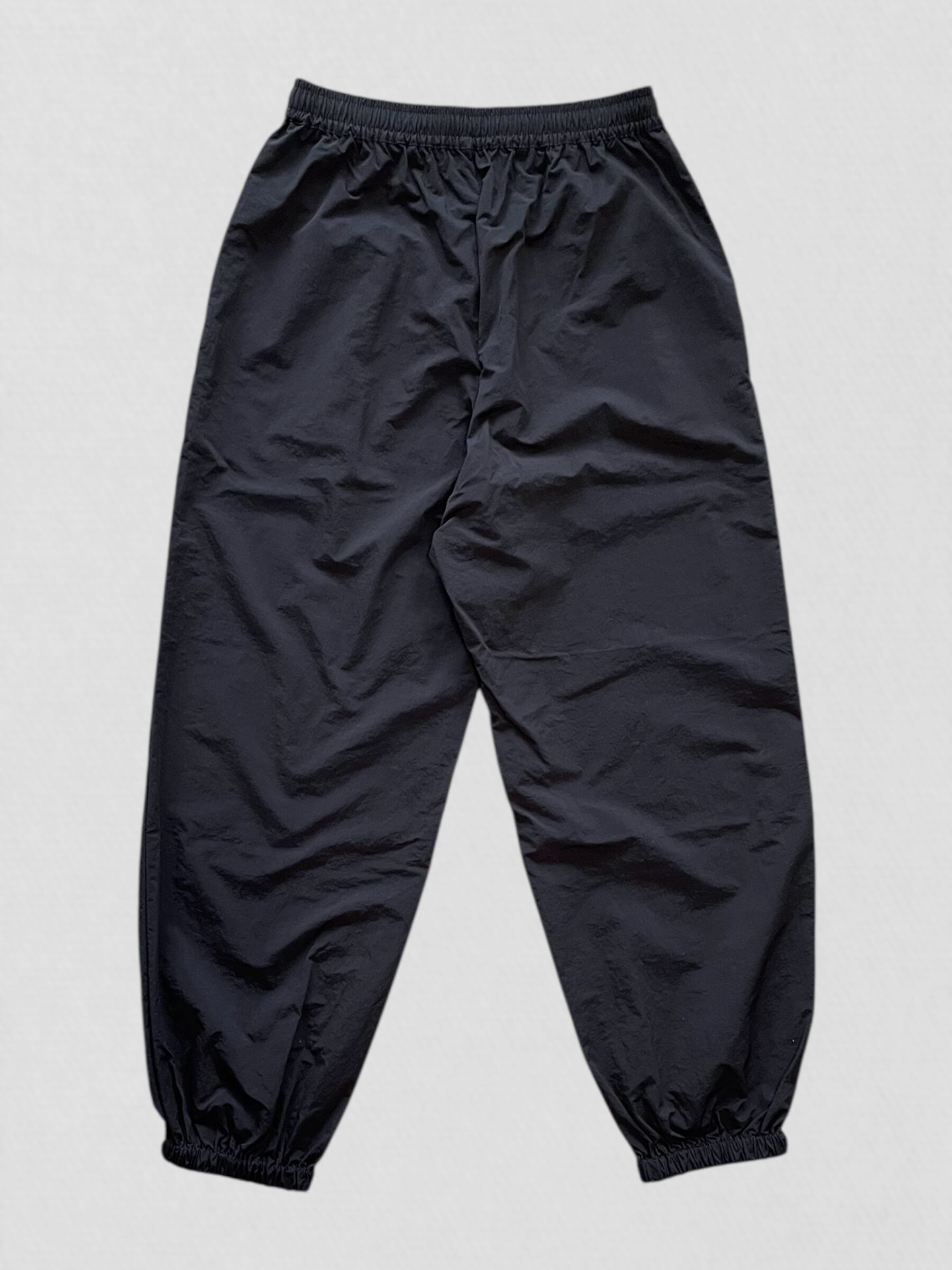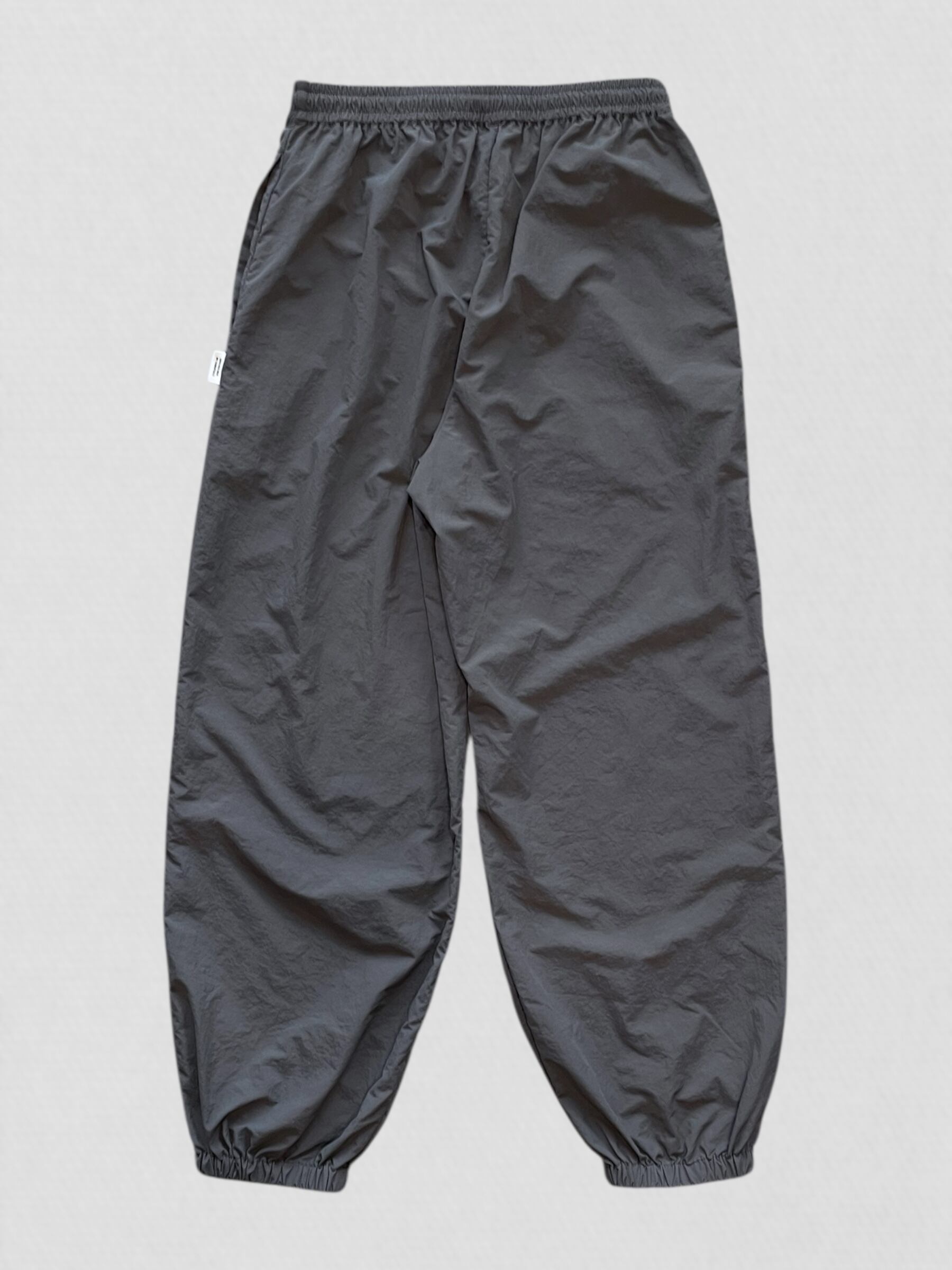のロゴがアクセントのナイロンパンツ。